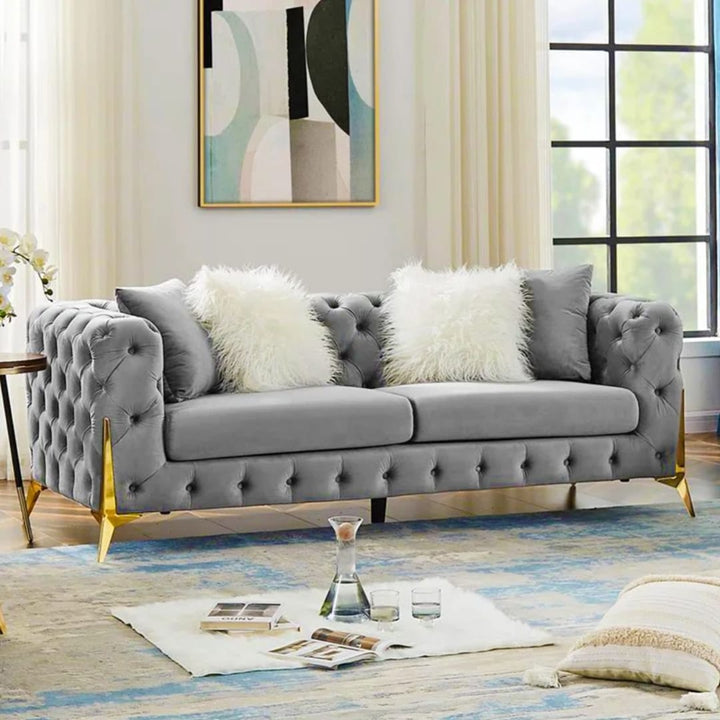 The deep button-tufted Chesterfield design covers the entire sofa, including the arms and backrest, creating a bold statement piece with a luxurious look. High-quality upholstery enhances the plush feel, while the high back provides excellent support for relaxing in style.